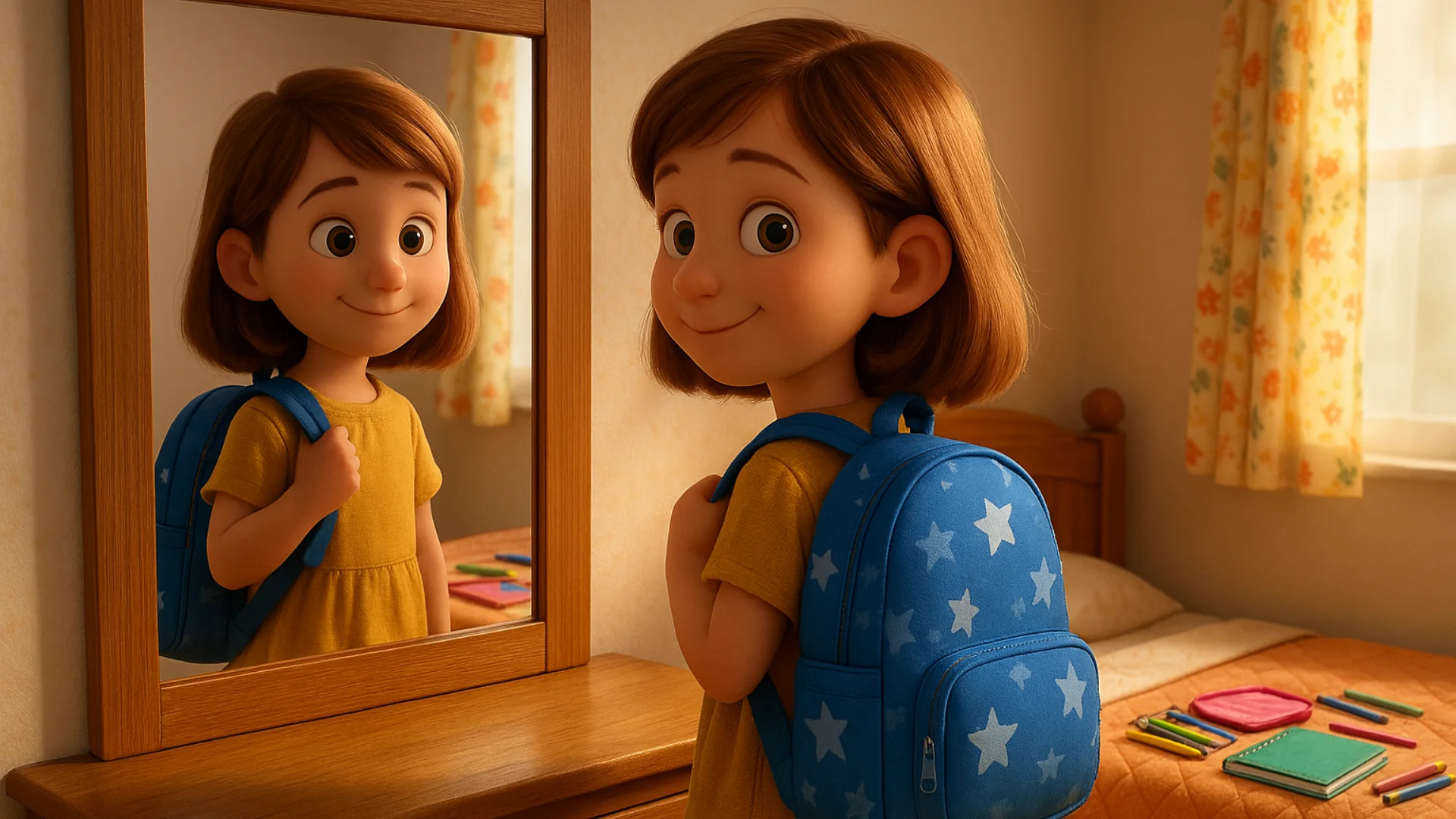 Eve döndüklerinde Ada aldığı tüm eşyaları yatağın üzerine yaymış. Kalemleri renk sırasına göre dizmiş, defterlerin sayfalarını tek tek çevirmiş. Kalemliğini açıp kapamış, silgisini eline alıp şekline bakmış. Sonra çantasını omzuna takıp aynaya bakmış ve kendi kendine gülümsemiş. “Belki de okul sandığım kadar korkunç değildir,” diye mırıldanmış.